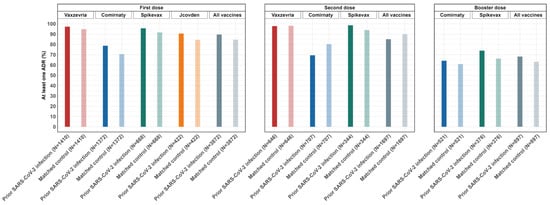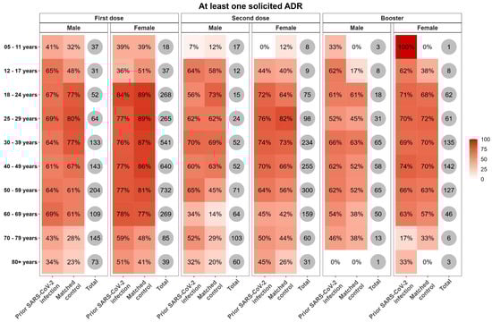 After the first and the booster dose, vaccinees with prior SARS-CoV-2 infection reported at least one ADR with higher frequencies than those matched without prior infection (3470 [89.6%] vs. 2916 [75.3%], and 614 [68.2%] vs. 546 [60.6%], respectively). On the contrary side, after the second dose, vaccinees with a history of SARS-CoV-2 infection reported at least one ADR with a lower frequency compared to matched controls (1443 [85.0%] vs. 1543 [90.9%]) (Figure 3, Supplementary Tables S2–S4).