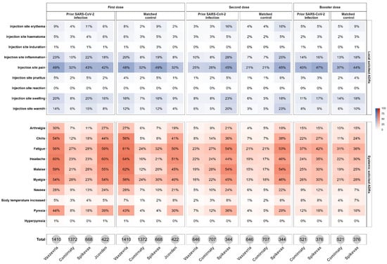 The following supporting information can be downloaded at: https://www.mdpi.com/article/10.3390/vaccines12030241/s1, Figure S1: Heatmaps with the frequency of reported local solicited ADRs following the first, second and the booster dose of any vaccine in people with SARS-CoV-2 infection vs. matched control, stratified by gender. Figure S2: Heatmaps with the frequency of reported systemic solicited ADRs following the first, second and the booster dose of any vaccine in people with SARS-CoV-2 infection vs. matched control, stratified by gender. Figure S3: Forest plot relating medical history to the occurrence of at least one ADR in people with prior SARS-CoV-2 infection for the first and the booster dose. Table S1: Experimental and observational studies related to COVID-19 vaccines in clinicaltrials.gov and PubMed, as of November 21, 2023. Table S2. Frequency of reported local and systemic solicited ADRs following the first dose, stratified by vaccine brands, in people with SARS-CoV-2 infection vs. matched control. Table S3. Frequency of reported local and systemic solicited ADRs following the second dose, stratified by vaccine brands, in people with SARS-CoV-2 infection vs. matched control. Table S4. Frequency of reported local and systemic solicited ADRs following the booster dose, stratified by vaccine brands, in people with SARS-CoV-2 infection vs. matched control. Table S5. Frequency of reported local and systemic solicited ADRs following the first vaccination cycle of any vaccine, stratified by gender, in people with SARS-CoV-2 infection vs. matched control. Table S6. Frequency of reported local and systemic solicited ADRs following the booster dose of any vaccine, stratified by gender for people with SARS-CoV-2 infection and the matched control. Table S7. Frequency of people with prior SARS-CoV-2 infection reporting at least one ADR, stratified by different timeframes between SARS-CoV-2 infection and vaccine administration, and vaccine dose. Table S8. Frequency of people with prior SARS-CoV-2 infection reporting at least one ADR, stratified by different variants of concern. Table S9. Frequency of people with prior SARS-CoV-2 infection reporting at least one ADR, stratified by different severity of symptoms. Table S10. People with prior SARS-CoV-2 infection stratified by country.