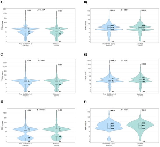 Combination of violin plots and box-plots of the median time to onset and the median time to recovery (in hours) of vaccinee-reported ADRs following a first vaccination cycle or a booster dose, in people with prior SARS-CoV-2 infection vs. matched controls. (A) Median time to ADR onset (in hours) following the first dose. (B) Median time to recovery (in hours) following the first dose. (C) Median time to ADR onset (in hours) following the second dose. (D) Median time to recovery (in hours) following the second dose. (E) Median time to ADR onset (in hours) following the booster dose (F) Median time to recovery (in hours) following the booster dose. Abbreviations: * = statistically significant.