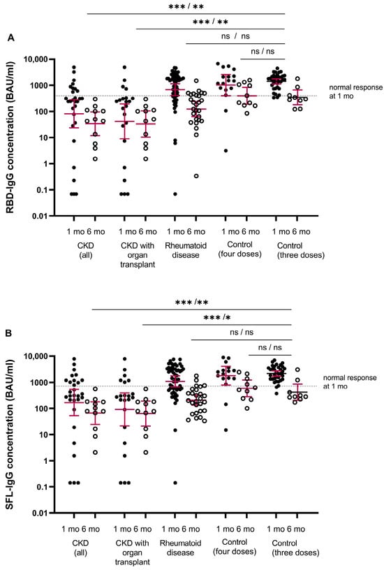 SARS-CoV-2 specific mean IgG antibody concentrations (GMC, 95% CI, binding antibody unit (BAU)/mL) to (A) receptor binding protein of spike protein (RBD-IgG) and (B) full-length spike protein (SFL-IgG). Data are shown for serum samples of participants with chronic kidney disease (CKD, all) (n = 29/13), CKD with organ transplant (n = 22/11), rheumatoid disease (n = 53/27) for controls after four doses (n = 17/10) and for controls after three doses (n = 35/9) at one/six months after the COVID-19 vaccine, respectively. Antibody levels at one and six months after the last vaccine are shown by closed and open circles, respectively. Participants who received the mRNA-1273 vaccine (any dose) are not included. The fifth percentile of RBD- and SFL-IgG concentrations determined for the control group one month after the third dose is shown as a threshold for a normal response (dashed line). Differences between each group and the control group were evaluated via the Mann–Whitney test. * p < 0.0025, ** p < 0.001, *** p < 0.0001, and ns = not significant.