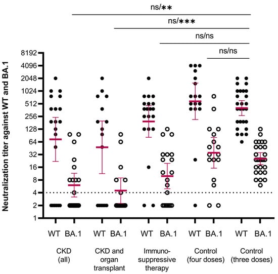 Neutralizing antibody titers against WT (closed circles) and BA.1 (open circles) SARS-CoV-2 strains. Data are shown for serum samples taken one month after the fourth dose of COVID-19 vaccine of participants with chronic kidney disease (CKD, all) (n = 20), CKD and organ transplant (n = 16), immunosuppressive therapy (n = 20), controls after four doses (n = 17) and controls after three doses (n = 27). Participants who received mRNA-1273 vaccine (any dose) are not included. The threshold for a positive titer (>4) is shown as a dashed line. Differences in NAb titers against WT and BA.1 strains between each group and the control group were evaluated by the Mann–Whitney test. ** p < 0.001, *** p < 0.0001, ns = not significant.