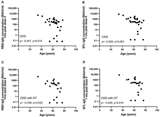 Correlation between age and RBD- (A,C) and SFL-IgG antibody concentrations (B,D) in CKD (n = 29) (A,B) and CKD with OT (n = 22) (C,D) groups one month after the fourth COVID-19 vaccine dose. Spearman correlation coefficients are shown.