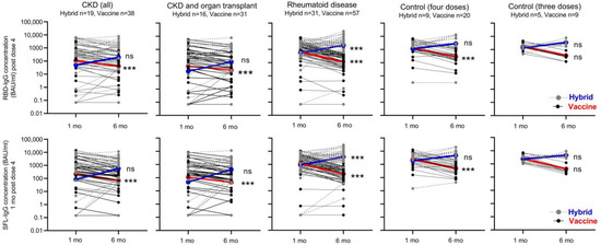 Kinetics of SFL- and RBD-IgG antibody concentrations (BAU/mL) in participants with hybrid or vaccine-induced immunity. Data are shown by disease and control groups at one and six months after booster dose of COVID-19 vaccine. Participants who became infected during the six-month follow-up and who thus developed hybrid immunity are shown by gray dotted lines/dots. Participants with vaccine-induced immunity are shown by black solid lines/dots. Geometric mean IgG concentrations of the groups are connected by blue (hybrid) and red (vaccine-induced immunity) lines. Significant differences in mean antibody concentrations between one and six months following the last vaccine dose in participants with vaccine-induced and hybrid immunity groups are shown; Wilcoxon signed-rank test, *** p < 0.0001, ns = not significant.
