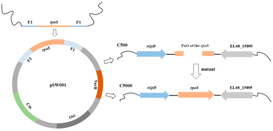 A schematic diagram of the restoring function of the rpoS gene of C500. The rpoS gene is partially missing in the C500 genome. The position of the rpoS gene in the C500 genome, and the position of the rpoS gene in the C500 genome after restoration.
