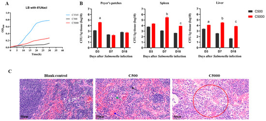 The biological characteristics and virulence analysis of the C5000 (C500 rpoS+). (A) Growth curves of S. Choleraesuis wild-type C3545, vaccine strain C500, and mutant strain C5000 (C500 rpoS+) in hypertonic LB broth (LB with 6% NaCl). (B) The bacterial load in mice liver, spleen, and PP at 3, 7, and 18 days after oral administration (n = 3). The total count of Salmonella colonies was calculated and presented as CFU per g of liver, spleen, or PP. (C) Histopathological assessment. S. Choleraesuis was orally administered to mice, and the effects on their organs were examined and contrasted with organ samples from animals given BSG as a placebo. Changes in the spleen’s histopathology were examined six days after administration. Blue arrows represent red blood cells, black arrows represent extramedullary hematopoietic cells, and green arrows represent macrophages. The red circle represents neutrophil infiltration. Images were captured with a magnification of 10× (scale bars 250 μm) and an inset magnification of 40× (scale bars 50 μm). Data are presented as the means ± SEM, and the superscript letters a, b, and c indicate p < 0.05 for comparisons with the C500 group at 3, 7, and 18 days, respectively.