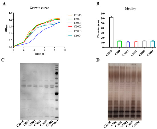 Bacterial strain phenotypes were identified in vitro, and each experiment was conducted not less than twice. The growth of Salmonella mutants was assessed in LB broth or LB broth containing 6% NaCl. Briefly, a single bacterial strain clone was selected, placed into LB broth, and cultured for the entire night at 37 °C and 180 rpm. The following day, the overnight culture was incubated under the same conditions after being diluted 100 times into the corresponding fresh medium. The bacterial solution’s optical density value at 600 nm (OD600) was determined every hour. Finally, the recorded results were summarized, and the growth curves of all mutant strains were plotted via the Graph-Pad Prism 8.0 software. As previously described, outer membrane proteins (OMPs) [38] and LPS [42,43] were isolated from S. Choleraesuis. The OMPs underwent electrophoresis on a sodium dodecyl sulfate-polyacrylamide gel (SDS-PAGE) and were subsequently treated with Coomassie brilliant blue. The bacterial strains of S. Choleraesuis went through silver staining to establish their LPS profile following the method outlined by Hitchcock and Brown [44]. The swimming motility of the bacteria was evaluated by employing LB plates that were solidified using 0.3% agar (wt/vol), as previously delineated [45]. In short, 0.3% agar LB plates were inoculated with 5 μL of bacterial suspension (roughly 8 × 106 CFU/mL) and then incubated for 8 h at 37 °C in an incubator. A ruler was used to determine the swimming diameter.