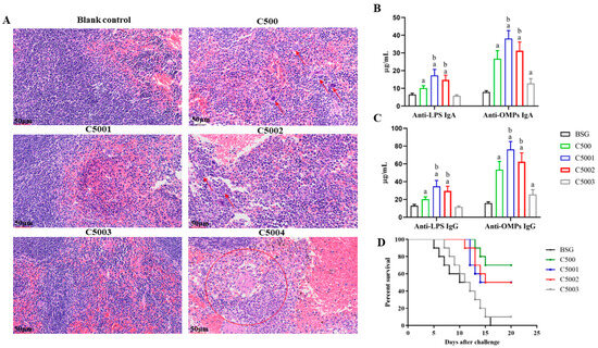 The histopathological analysis and immunogenicity assessment induced by C5001 (C500 rpoS+ Δcrp10), C5002 (C500 rpoS+ Δfur9), C5003 (C500 rpoS+ ΔphoP11), and C5004 (C500 rpoS+ ΔaroA12). (A) The effects of recombinant attenuated S. Choleraesuis on organs were assessed by histopathological examination. The red arrows represent macrophages, and the red circles represent neutrophil infiltration. Images were captured with a magnification of 10× (scale bars 250 μm) and an inset magnification of 40× (scale bars 50 μm). (B,C) Recombinant attenuated S. Choleraesuis based on the C500 strain was investigated for immunogenicity by quantitative ELISA. The results displayed the precise levels of IgA and IgG antibodies, as measured by a standard curve, in mice orally inoculated with attenuated S. Choleraesuis at the scheduled weeks. The standard differences between the mice in each group were shown by the error bars. (D) Following the challenge, mortality was recorded for 25 days. Data are presented as the means ± SEM (n = 12), and the superscript letters a and b indicate p < 0.05 for comparisons with the BSG and C500 groups, respectively.