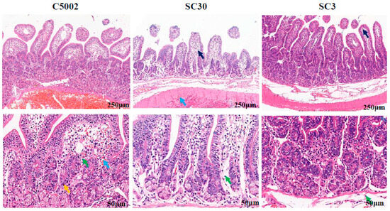 We also assessed the induced inflammation in mice after the mutants harboring ΔpagP81::Plpp lpxE ΔlpxR9 infected mice 7 days later; no noticeable histopathological changes were observed (Supplementary Figure S3). To further evaluate the endotoxic activity of these mutant strains, the rabbit ileal loops were used for this purpose. After being injected into ligated loops, mutant strains were cultured for eight hours. H&E-stained histological samples from loops treated with several mutant strains were viewed under a microscope. The C5002 (C500 rpoS+ Δfur9) strain caused severe damage to the mucosa of mice, resulting in a large necrotic infiltration of the epithelium and a large infiltration of polymorphonuclear leukocytes (PMN). In contrast, the mutant strain SC3 (C500 rpoS+ Δfur9 ΔpagL7 ΔpagP81::Plpp lpxE ΔlpxR9) induced some tissue destruction and no apparent PMN infiltration (Figure 5), indicating that the 1′-dephosphorylated lipid A in S. Choleraesuis aids in a reduction in the inflammatory response.