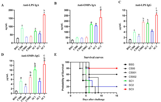 An immune response assay induced by recombinant attenuated S. Choleraesuis. Serum and vaginal secretions of mice were gathered at 8 weeks post-initial vaccination. Quantitative ELISA was applied to analyze specific IgA (A,B) and IgG (C,D) against S. Choleraesuis OMP and LPS. The results displayed the precise levels of antibodies, as measured by a standard curve, in mice orally inoculated with attenuated S. Choleraesuis at the scheduled weeks. The standard differences between the mice in each group were shown by the error bars. (E) Following the challenge, mortality was recorded for 25 days. Data are presented as the means ± SEM (n = 5), and the superscript letters a, b, and c indicate p < 0.05 for comparisons with the BSG, C500, and SC1 groups, respectively.