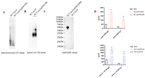 To evaluate the ability of SC3 (C500 rpoS+ Δfur9 ΔpagL7 ΔpagP81::Plpp lpxE ΔlpxR9) as a vector to deliver heterologous antigens, we selected the GDH protein antigen of S. suis and the O-polysaccharide antigen of E. coli O9. GDH is a glutamate dehydrogenase protein on the surface of S. suis, an important virulence factor and effective antigen of S. suis. The O-polysaccharide is a potent protective antigen of gram-negative bacteria. In this study, we evaluated the ability of SC3 (C500 rpoS+ Δfur9 ΔpagL7 ΔpagP81::Plpp lpxE ΔlpxR9) as a vector to deliver the GDH protein antigen and O-polysaccharide antigen. The results showed that the 48 kDa GDH protein and O-antigen of E. coli O9 were detected in SC3 Δasd (C500 rpoS+ Δfur9 ΔpagL7 ΔpagP81::Plpp lpxE ΔlpxR9 Δasd) (Figure 7A–C), indicating that the plasmids in SC3 Δasd (C500 rpoS+ Δfur9 ΔpagL7 ΔpagP81::Plpp lpxE ΔlpxR9 Δasd) are stable and able to synthesize both protein antigens and O-polysaccharide antigens.