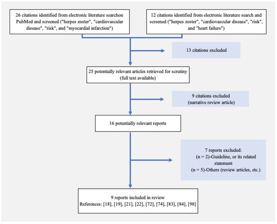 The keywords “cardiovascular disease”, “herpes zoster”, “heart failure”, and “myocardial infarction” were searched in PubMed. The research time frame for the database was until December 2023. The language was limited to English. The titles and abstracts of all potentially relevant articles were read to determine their relevance. Full articles were also scrutinized if the titles and abstracts were unclear. Reference lists of identified articles were screened to ensure the completeness of the search.
