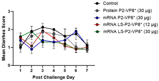 Gn pigs were challenged with virulent Wa HRV at post-inoculation day (PID) 35/post-challenge day (PCD) 0, and clinical signs and virus shedding was monitored via daily rectal swabs (RS). These data are summarized in Table 2. The percentage of animals with diarrhea and the mean days to onset remained largely unchanged compared to negative control animals for all mRNA, as well as the protein comparator groups. Pigs who received mRNA P2-VP8* (30 µg) and LS-P2-VP8* (30 µg) had a significantly shortened duration of diarrhea compared to the negative control pigs (3.1 days and 2.5 days versus 4.6 days, respectively) (Table 2). All pigs who received mRNA vaccines had a significantly decreased AUC of diarrhea that was 2.2–2.6 lower than control pigs (Table 2). Indeed, negative control pigs experienced a double peak of diarrhea at PCDs 3 and 6, while pigs vaccinated with LS-P2-VP8* (12 µg and 30 µg) only experienced one peak at PCD 2 and PCD 3, respectively, which then tapered off to consistently lower scores for the rest of the study (Figure 1). mRNA P2-VP8* (30 µg)-vaccinated pigs experienced a slight peak at PCD 3, and a larger peak, comparable to control pigs, at PCD 6 (Figure 1). Throughout the observation period, mean diarrhea score values were overall lower in all mRNA groups compared to the negative control with the exception of PCD 6 for the P2-VP8* group, where scores were comparable. The reduced severity of diarrhea was also reflected by significantly decreased cumulative fecal scores that were 2.1–2.4 lower in the mRNA vaccine groups compared to the controls (Table 2). Protein P2-VP8*-vaccinated pigs experienced overall similar trends to the mRNA groups. However, there was a trend towards improved values for LS-P2-VP8* mRNA vaccine compared to protein P2-VP8* in terms of the mean duration days (30 µg only), mean cumulative fecal score, and AUC of diarrhea (both dose groups). In addition, mean diarrhea scores after the peak at PCD 3 trended higher in protein than in mRNA-vaccinated groups for the duration of the study. An exception was PCD 6, where mean diarrhea scores in the protein P2-VP8* group were comparable to mRNA LS-P2-VP8* vaccines but were lower than in mRNA P2-VP8*-vaccinated pigs. (Figure 1). Overall, a trend towards improved clinical signs elicited by LS-P2-VP8* compared to the mRNA P2-VP8* and the protein P2-VP8* was detected.