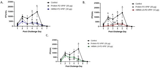 Daily fecal virus shedding as measured by CCIF for PCD 0–7 in mRNA P2-VP8* (30 μg) (A), mRNA LS-P2-VP8* (12 μg) (B), and mRNA LS-P2-VP8* (30 μg)-vaccinated pigs (C) versus control and protein P2-VP8* (30 μg)-vaccinated pigs. Daily rectal swabs were taken for evaluating fecal virus shedding after challenge with Wa HRV. Fecal infectious virus particles were measured by CCIF and results are expressed as FFU/mL. Fecal samples from mock-infected pigs were used as negative controls. Different capital letters above data points indicate significant differences (adjusted p < 0.05) between groups at the same time point, while shared letters or no letters indicate no significant difference, according to two-way ANOVA, followed by Tukey’s multiple comparisons test. Circles indicate means with SEM. CCIF, cell culture immunofluorescence; FFU, focus forming units.