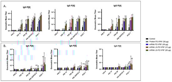 Low levels of P-type-specific IgA titers were detected in LS-P2-VP8*-vaccinated pigs as early as PID 14, but not to a significant degree until PID 35, when P[8]- and P[6]-specific serum IgA titers were significantly higher in the LS-P2-VP8* (30 µg) groups compared to negative control, protein P2-VP8*, and mRNA P2-VP8*-vaccinated pigs (Figure 3B). Post-challenge, both doses of LS-P2-VP8* vaccine primed for significantly higher serum IgA against P[8] and P[6] VP8* compared to negative control and protein P2-VP8*-vaccinated pigs, with the exception of IgA against P[6], where the increase induced by 30 µg LS-P2-VP8* was not significantly higher than in the protein P2-VP8* group. P[4]-specific IgA titers were significantly higher in LS-P2-VP8* (12 µg)-vaccinated pigs than the negative control pigs post-challenge (Figure 3B).