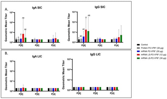 Geometric mean titers of P-type-specific IgG and IgA antibodies in Gn pig intestinal content samples collected at PCD 7. Samples were tested at a series of 4-fold dilutions, beginning at 1:4. All negative samples were given a titer of 2 to allow for data analysis and use in graphical depictions. Different capital letters above bars indicate significant differences (adjusted p < 0.05) between groups, while shared letters or no letters indicate no significant difference, according to mixed-effects analysis, followed by Tukey’s multiple comparisons test. (A) SIC, small intestinal contents; (B) LIC, large intestinal contents. Bars indicate geometric means with geometric SD.