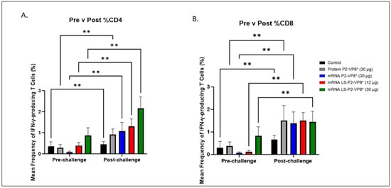 Mean frequencies (%) of CD3+CD4+IFN-γ+ (A) and CD3+CD8+IFN-γ+ (B) T cells in the blood pre- versus post-challenge. For comparing between pre- and post-challenge for the same group, two-way ANOVA, followed by Tukey’s multiple comparisons test, was used (n = 8–13; ** p ≤ 0.01). Bars indicate means with SEM.