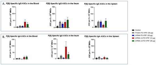 MNCs extracted from the blood, ileum, and spleen were used to evaluate P-type-specific IgG and IgA ASC responses post-challenge by an ELISpot assay. LS-P2-VP8*-vaccinated pigs had higher numbers of P[8]-specific IgG ASCs detected in the blood and exhibited a trend towards increased responses in the ileum (30 µg group) post-challenge compared to other groups, although not to a significant degree. Protein P2-VP8*-vaccinated pigs had numbers comparable to mRNA P2-VP8* in the blood and spleen, and to LS-P2-VP8* (12 μg)-vaccinated pigs in the ileum (Figure 6A). All vaccine groups except for the 12 µg LS-P2-VP8* group induced higher numbers of P[8]-specific IgG ASCs in the spleen compared to the negative control, indicating that vaccination was able to prime for a systemic memory B-cell response upon subsequent virus exposure in the secondary lymphoid tissue (Figure 6A). Similarly, all LS-P2-VP8*-vaccinated pigs were primed for higher numbers of P[8]-specific IgA ASCs in the blood and ileum post-challenge, although these numbers were not statistically significant. (Figure 6B).
