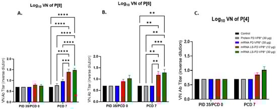 Serum samples collected pre- and post-challenge were used to evaluate P-type-specific neutralizing antibody (nAb) titers in Gn pigs. None of the vaccines induced significant VN titers pre-challenge compared to the negative control group (Figure 7). However, both LS-P2-VP8* doses induced responses against P[4], P[6], and P[8] serotypes on PCD 7, while little or no responses were induced in the other groups. nAb titers against P[8]- and P[6] viruses were significantly higher in LS-P2-VP8*-vaccinated animals compared to both negative control and protein P2-VP8*-vaccinated pigs (Figure 7A,B).