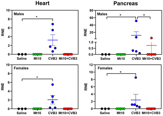 Vaccine recipients did not reveal viral RNA in the pancreas. Groups of mice were administered two doses of saline or Mt10, and 7 days later challenged with or without CVB3. Three weeks post-challenge, hearts and pancreata were collected, total RNA was extracted, and expression of CVB3 VP1 was analyzed by SYBR Green-based qPCR. The GAPDH gene was used to normalize the expression of viral RNA (∆∆Cq), and relative normalized expression (RNE) values were calculated. Mean ± SEM values representing 3–6 samples per group are shown. One-way ANOVA and the Kruskal–Wallis test were used to determine significance between groups. * p ≤ 0.05.