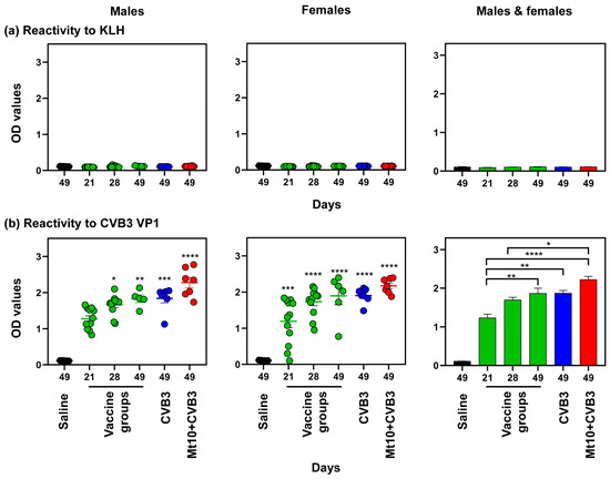 Mt10 vaccine induces CVB3 VP1-specific antibodies in DO mice. Serum samples collected from the above groups were diluted (1:100) and added in duplicates to high binding plates coated overnight with (a) CVB3 VP1 or (b) KLH (negative control). After adding HRP-conjugated goat anti-mouse total Ig detection antibody, reactions were stopped, and plates were read at 450 nm to obtain the OD values. Mean ± SEM values obtained from 5 to 8 mice for males (left panels), females (middle panels), and both males and females combined (right panels) are shown. One-way ANOVA and the Kruskal–Wallis test were used to determine significance between groups, and p values in left and middle panels indicate differences from the saline group. * p ≤ 0.05, ** p ≤ 0.01, *** p ≤ 0.001, and **** p ≤ 0.0001.