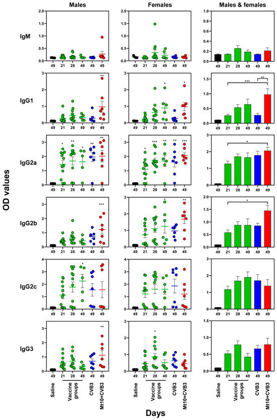 Mt10 vaccine preferentially induces IgG antibodies. High binding ELISA plates were coated with CVB3 VP1 overnight, and the diluted (1:100) serum samples from the indicated groups were added to the wells in duplicates. After adding HRP-conjugated goat anti-mouse IgM, IgG1, IgG2a, IgG2b, IgG2c, and IgG3 detection antibody, reactions were stopped, and plates were read at 450 nm to obtain the OD values. Mean ± SEM values obtained from 5 to 8 mice for males (left panels), females (middle panels), and both males and females combined (right panels) are shown. One-way ANOVA and the Kruskal–Wallis test were used to determine significance between groups, and p values in left and middle panels indicate differences from the saline group. * p ≤ 0.05, ** p ≤ 0.01, and *** p ≤ 0.001.