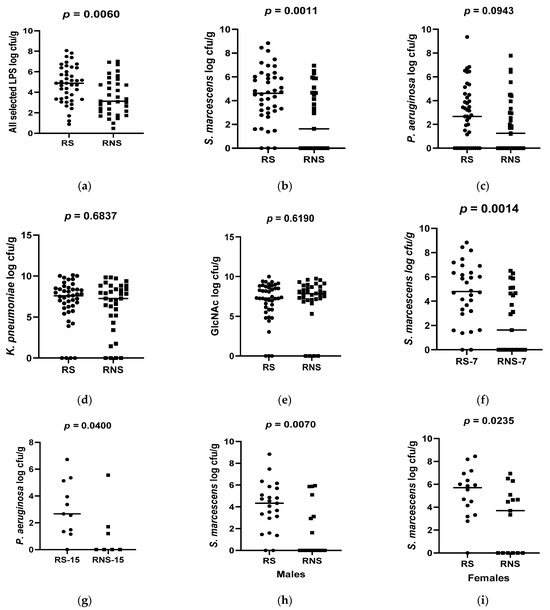 Box plots showing abundances of selected LPS-rich bacteria and N-acetylglucosamine 7 between rotavirus vaccine shedders (RS) and non-shedders (RNS): (a) average of all selected LPS-bacteria (b) S. marcescens (c) P. aeruguinosa (d) K. pneumonia (e) N-acetylglucosamine (f) S. marcescens at 7 weeks of age (g) P. aeruguinosa at 15 weeks of age (h) S. marcescens in males (i) S. marcescens in females.