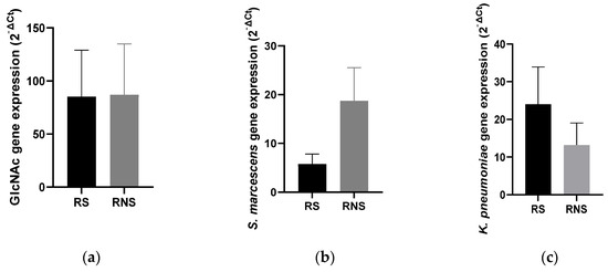 Bar charts showing average expression levels of genes coding for LPS and N-acetylglucosamine in selected LPS-rich bacteria between rotavirus vaccine shedders and their non-shedding counterparts: (a) N-acetylglucosamine (b) kdtX (S. marcescens) (c) WaaE (K. pneumonia).