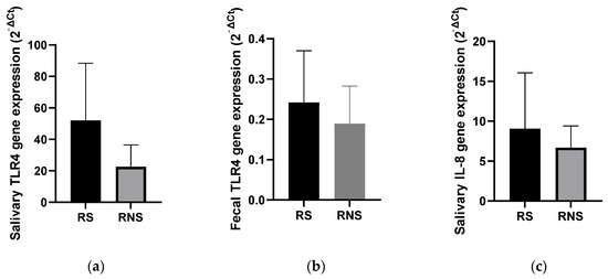 Bar charts showing expression levels of genes coding for TLR4 and IL-8 in stool saliva samples of rotavirus vaccine shedding (RS) and non-shedding (RNS) infants: (a) TLR4 expression in saliva (b) TLR4 expression in fecal samples (c) IL-8 expression in saliva samples.