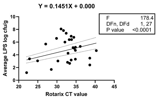 The average counts of all selected LPS-rich bacteria (Ct values) and shedding status (yes or no) were used to evaluate their association with rotavirus vaccine shedding in the stool samples of the study infants. Logistical regression analysis indicated that infants with high counts of selected LPS-rich bacteria were 1.5 times likely to shed the vaccine in stool samples (95% CI = 1.1–1.89), and there was a significant association between the counts of LPS-rich bacteria and vaccine shedding, p = 0.007. The vaccine shedding (Ct values) was used as a quantitative variable to evaluate its association with the abundance of LPS, and the results (Figure 4) validated the association between the abundance of bacterial LPS and vaccine shedding (yes or no) variable.