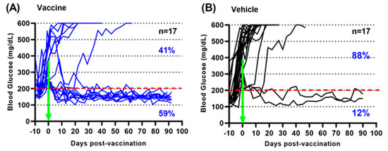 (A) Salmonella-based vaccine reverses new-onset diabetes in mice. Recently hyperglycemic NOD mice were given the Salmonella vaccine (n = 17, (A)) or the vehicle (n = 17, (B)) and blood glucose levels were determined for 3 months. Blood glucose levels above the hashed red line are taken as abnormal. Initiation of treatment is highlighted by the green arrow.