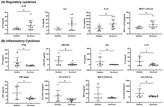 Cytokines play crucial roles in regulating the interaction between beta-cells and immune cells in the development of T1D. For example, cytokines induced regulatory functions to restore immune tolerance and prevent the destruction of beta-cells [33]. In addition, other cytokines induced inflammatory functions that promoted the differentiation and function of immune cells, leading to T1D onset and progression [33]. To assess if the vaccine induced tolerance, circulating tolerogenic and inflammatory cytokines were quantified in serum from vaccinated mice (n = 17) and serum levels from diabetic (non-responders) and reversed (responders) mice were compared (Figure 2). Levels of tolerogenic cytokines IL10, IL2, IL13, and MCP-1 (CCL2) were increased in the serum of reversed (responders) compared with diabetic mice (non-responders) (unpaired t test, p = 0.045, 0.06, 0.04, and p = 0.04) (Figure 2A). Conversely, pro-inflammatory cytokines IFNγ, GM-CSF, IL6, IL12, and TNFα were lower in the serum of reversed (responders) compared with diabetic animals (non-responders) (unpaired t test, p = 0.043, p = 0.04, p = 0.04, 0.03, and p = 0.02) (Figure 2B). Furthermore, lower amounts of inflammatory chemokines CXCL1, CXCL2, and CXCl5 were detected in the serum of vaccine-treated mice (p = 0.04, p = 0.09, and p = 0.04) (Figure 2B). In addition, circulating tolerogenic and inflammatory cytokines were quantified in serum from vaccinated mice (n = 17) and compared to levels in serum from vehicle-treated mice (n = 17) (Figure S1). Regulatory cytokines IL10, Il2, IL13, and CCL2 were increased in vaccine- compared to vehicle-treated mice (Figure S1A). No differences were seen in inflammatory cytokines among the treatment groups (Figure S1B). The increase in IL10 levels is likely not the result of IL10 being over-expressed by the Salmonella vector since IL10 levels were measured 3 months after Salmonella was cleared from the animals. LPS antibodies against Salmonella were increased in the serum of Salmonella-infected animals as well as in the serum of vaccine- compared to vehicle-treated animals (one–way ANOVA, p < 0.0001, and p < 0.0001) (Figure S2).