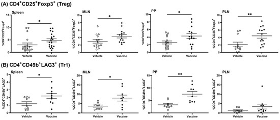 To test whether the Salmonella-based vaccine induced tolerance via Tregs, we examined the type and number of Tregs present in vaccine- and vehicle-treated animals using flow cytometry. To identify the specific cell types that were involved in the vaccine-mediated effects, the frequency of regulatory T-cells in lymphatic organs (spleens, MLNs, PPs, and PLNs) of vaccine-treated mice was characterized (Figure S3). Greater percentages of regulatory CD4+ CD25+ Foxp3+ (Treg) cells were present in the spleens, MLNs, PPs, and PLNs of vaccinated mice compared to vehicle-treated mice (Mann–Whitney test, p = 0.019, p = 0.032, p = 0.049, and p = 0.004) (Figure 3A).