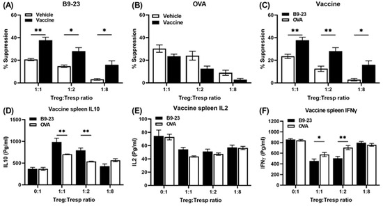 A Salmonella-based vaccine induces antigen-specific suppressor Tregs. CD4C+ D25− Tresps isolated from splenocytes of B9-23 challenged mice were dye-labeled, cultured with splenic APCs pulsed with insulin peptide B9-23 (10 mg/mL), and co-cultured for 4 days with different ratios of CD4+ CD25+ Tregs. Percent suppression activity of Tregs from vaccine- and vehicle-treated mice after stimulation with B9-23 (A), OVA peptide (B), or vaccine-treated mice after stimulation with insulin B9-23 and OVA peptide (C). Measurement of IL10 (D), IL2 (E), and IFNγ (F) in conditioned medium by ELISA assay after stimulation of cells with peptides B9-23 and OVA. The data shown are the average ± SD from two separate experiments. Statistical analysis was performed by two-way ANOVA (* p < 0.05, ** p < 0.01).