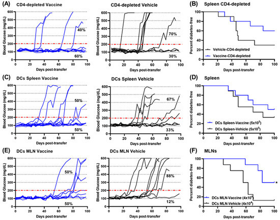 DCs from vaccinated mice are anti-diabetogenic. A month after treatment, pooled splenocytes were obtained from NOD mice and given to NSG mice (A,B) or to non-diabetic NOD mice (C,D). DCs derived from the MLNs of treated mice were given to NOD mice (E,F). Blood glucose levels were tracked (A,C,E). Log-rank plot of the percentage of recipient mice that remained diabetes-free over time (B,D,F). Log-rank (Mantel–Cox) test of differences between the vaccine- and vehicle-treated mice was significant. The dotted red line indicates the threshold blood glucose level of 200 mg/dL. (* p < 0.05).