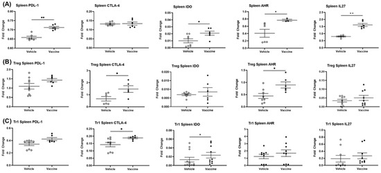 Immune inhibitory surface proteins such as CTLA4, CD47, and SIRPα, among many others, provide a means for limiting autoimmunity. These cell surface receptors can be found on many immune cell types including T, NK, and dendritic cells and macrophages [53] but are in certain cases also found in non-immune cells. Expression levels of mRNAs in CD11c+ (DCs), CD4+ CD25+ Tregs, and CD4+ CD49b+ Tr1 cells from spleens of vaccine- and vehicle-treated mice were determined. PDL-1, IDO, AhR, and IL27 mRNA were increased in splenocytes from vaccine- compared to vehicle-treated animals (Figure 7A). Splenic Tregs and Tr1 cells from vaccine-treated mice displayed significantly more CTLA-4, AhR, PDL-1, and IDO mRNA compared to cells from vehicle-treated animals (Figure 7B,C). Splenic DCs from vaccine-treated mice showed less PDL-1, upregulated IDO, and no changes in AhR or IL27 mRNA compared to cells from vehicle-treated mice (Figure 8A). MLN DCs from vaccine-treated mice showed increased levels of PDL-1, IDO, AhR, and IL-27 mRNA in comparison to cells from vehicle-treated mice (Figure 8B). Splenic DCs from vaccine-treated mice showed increased DC-SIGN mRNA (dendritic cell-specific intercellular adhesion molecule-3–grabbing non-integrin; CD209A) compared to cells from vehicle-treated animals (Figure S6). DC-SIGN is associated with the inhibition of inflammation and is found primarily on DCs and some macrophages [54].