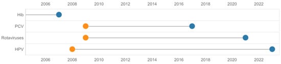 Specifically, for certain vaccines, only vaccinations against COVID-19 and HPV were part of broader strategies [36,37]. The plan for population access to the HPV vaccine was included in the National Oncological Strategy, approved by Parliament in 2019. In line with this strategy, a vaccination program against HPV was planned in 2021 for adolescent girls and boys in the following years [37]. However, vaccinations for children aged 12 and 13 started in mid-2023 (Figure 1) [38]. The strategic aim is to vaccinate 60% of adolescents against HPV by the end of 2028 [37]. The program’s early performance is around 10%, and most patients (90%) were vaccinated with the nine-valent product (data from 1 September to 23 August). To increase coverage, the two-valent vaccine was 100% and 50% reimbursed for children and adolescents <18 years old and adults, respectively. However, the strategy quickly adapted to the program’s efficiency and vaccine demand, but it did not benefit from the experiences of other countries that implemented the program previously; i.e., it is not supported by the outcomes of post-registration scanning [39].
