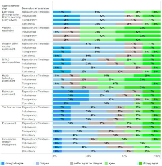 All 12 advisory panel members responded to an online questionnaire evaluating timeframes, inclusiveness, transparency, and consistency in the vaccine market access pathway, and the results are presented in Figure 2. Table 1 summarizes the key recommendations to improve vaccine assessment pathways and decision making in the immunization program.