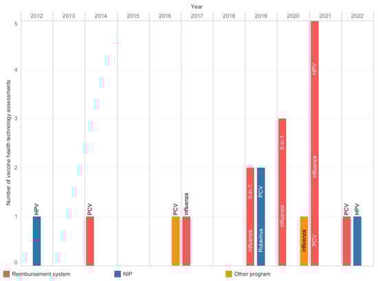 Health technology assessments were performed at the Agency for Health Technology Assessment and Tariff System from 2012 to 2022. Information from archives of the Public Information Bulletin of the Agency [23]. 6-in-1: multicomponent diphtheria, tetanus, pertussis, polio, Haemophilus influenzae type b, and hepatitis B vaccine; HPV: human papillomavirus; NIP: national immunization program; PCV: pneumococcal conjugate vaccine.