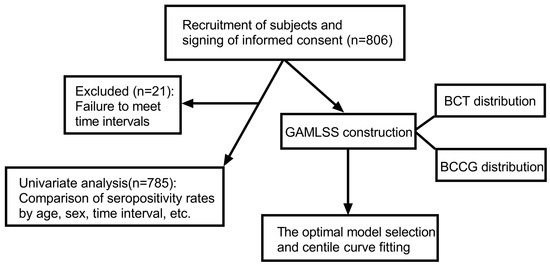 A total of 806 subjects were recruited. All of them underwent informed consent and varicella antibody testing and were included in the GAMLSS construction. In the analysis of VZV-IgG differences by groups such as age and sex, 21 were excluded after verifying that they did not meet the time interval (see Figure 1 for details). The average age of the 785 subjects was 4.00 ± 1.928 years, with 383 in the 1-year-old group and 402 in the 4-year-old group; in terms of sex, there were 397 males and 388 females; and the median antibody concentration of VZV-IgG was 192.05 (82.89–571.14) mIU/mL. The number of positives totaled 552, accounting for 70.3%. In terms of VarV history, 411 people received one dose of vaccine and 374 people received two doses of vaccine; all subjects in this study reported never having varicella.