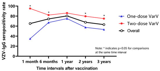 We conducted stratified analysis sequentially on the age groups, VarV doses, and time intervals. Statistically significant differences in VZV-IgG seropositivity rates at different time intervals after vaccination were observed in the 1- and 4-year-old groups, and in the one- and two-dose VarV groups (p < 0.05). Figure 2 shows the VZV-IgG seropositivity rate of different VarV dose groups, and it can be seen that in the one-dose VarV group, the positivity rate reached the highest (75%) at the first year of postvaccination and then slowly decreased; in the two-dose VarV group, the positivity rate firstly peaked at 1 month of postvaccination (95.2%), then declined to 6 months of postvaccination, increased again until 1 year of postvaccination, and finally, declined slowly. Meanwhile, the stratified analysis by time interval after vaccination revealed that the positivity rate of the two-dose group was significantly higher than that of the one-dose group at all time intervals, except for the 1 year after vaccination (p < 0.05).