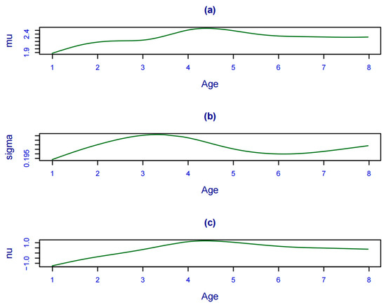 The BCT distribution and BCCG distribution were fitted sequentially after logarithmic treatment for antibody levels, while different smoothing functions were applied to each parameter, and the results are shown in Table 2. In the case of convergence of the parameter estimation, as well as according to the SBC, AIC minimization principle, M16 was the optimal model, i.e., a cubic spline function smoothing for υ, a p-spline function smoothing for μ and σ, and fitting the BCCG distribution to the antibody level. μ, σ, and υ were not constant across ages. In Figure 3a–c refer to the variations with age for μ, σ, and υ, respectively, which also illustrated the applicability and superiority of the GAMLSS.