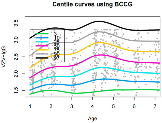 where μ represents the mean, σ represents the variance, υ represents the skewness, and τ represents the kurtosis. The first two parameters are characterized as location and scale parameters, and the remaining parameters are characterized as shape parameters. In this study, we fitted data to the Box–Cox-t (BCT) distribution, , and the Box–Cox Cole and Green (BCCG) distribution, , respectively, by taking the logarithm of VZV-IgG as the dependent variable and the corresponding age as the explanatory variable. Each parameter was smoothed using a cubic spline or p-spline smoothing function [17,18,19,20,21]. Model fitting was evaluated using a combination of Akaike information criterion (AIC) and Schwarz Bayesian criterion (SBC). Finally, the P3, P10, P25, P50, P75, P90, and P97 centile reference values of VZV-IgG among children aged 1–7 years in Changzhou were constructed according to the optimal model, and the centile chart was plotted.