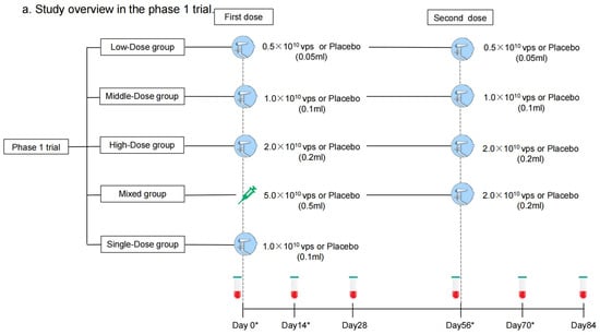 Study overview. Phase 1 trial (a) and Phase 2 trial (b). Blood samples were collected before vaccination on days 0 and 56. Blood samples were collected for humoral immunity. * means blood samples were collected for cellular immunity on days 0, 14, 56, and 70 as well.