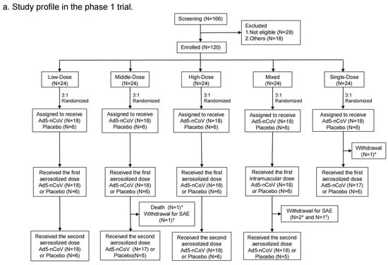 Study profile. Phase 1 trial (a) and Phase 2 trial (b). * means participants who received Ad5-nCoV; † means participants who received placebo.