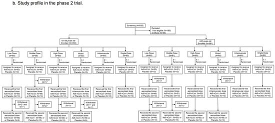 Each dose of aerosolized Ad5-nCoV contains replication-defective Ad5 vectors at a concentration of 1.0 × 1011 viral particles (vps) per mL. Convidecia, the intramuscular Ad5-nCoV, has been licensed, and was administered intramuscularly in a dose of 0.5 mL. The aerosolized Ad5-nCoV was inhaled at 0.05 mL, 0.1 mL, or 0.2 mL per dose. The placebo only consisted of the vaccine excipients, without any viral particles. In the phase 1 trial, participants were sequentially enrolled into one of five regimen cohorts: Low-Dose (aerosolized Ad5-nCoV with 0.5 × 1010 vps per dose, two doses), Middle-Dose (aerosolized Ad5-nCoV with 1.0 × 1010 vps per dose, two doses), High-Dose (aerosolized Ad5-nCoV with 2.0 × 1010 vps per dose, two doses), Mixed (intramuscular Ad5-nCoV with 5.0 × 1010 vp [first dose] and aerosolized Ad5-nCoV with 2.0 × 1010 vps [second dose]), and Single-Dose (aerosolized Ad5-nCoV with 1.0 × 1010 vps, one dose) groups (Figure 1a). Participants within each cohort were randomly allocated in a 3:1 ratio to receive Ad5-nCoV or a placebo. As to the phase 2 trial, participants were stratified into two age groups: 18–59 years old or ≥60 years old and then were sequentially enrolled into one of six regimen cohorts: Low-Dose, Middle-Dose, High-Dose, Mixed, Single-Dose, and Intramuscular Dose groups (one intramuscular dose of Ad5-nCoV with 1.0 × 1010 vps) (Figure 1b). Participants were randomly allocated in a 5:1 ratio to receive either Ad5-nCoV or placebo in each cohort (Figure 2). The interval between the two doses was 56 days. The randomization lists were created by a statistician independently with SAS (version 9.4). The assignment of the specific regimen cohorts was available for both participants and investigators, but they were masked for the treatment allocation within each regimen. The enrollment of the latter cohort was initiated after all the participants in the previous cohort had finished a 14-day safety observation.