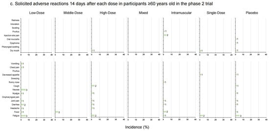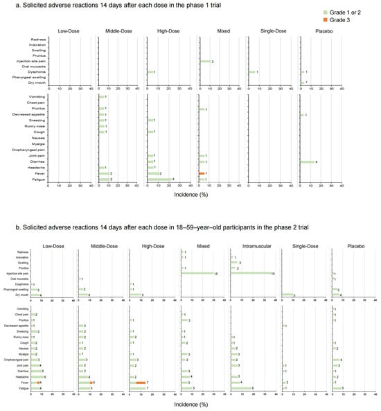 In the phase 2 trial, 18 participants (36.00%) versus 7 participants (14.29%) in the Low-Dose group (18–59 years old versus ≥ 60 years old), 15 participants (31.25%) versus 2 participants (3.92%) in the Middle-Dose group, 12 participants (24.00%) versus 3 participants (6.00%) in the High-Dose group, 23 participants (46.00%) versus 1 participant (2.04%) in the Mixed group, 25 participants (50.00%) versus 7 participants (14.00%) in the Intramuscular group, 9 participants (18.00%) versus 2 participants (4.00%) in the Single-Dose group and 14 participants (23.33%) versus 5 participants (8.33%) in the placebo group (p = 0.003 versus p = 0.108) reported at least one adverse reaction (Figure 3b,c, Table S3). In participants aged 18–59, the incidence rates of adverse reactions in the Mixed and Intramuscular groups were higher than in other groups within 14 days after vaccination. Dry mouth was the most frequent local adverse reaction via inhalation administration, and the most frequent local adverse reaction via injection was pain. Meanwhile, in the systemic adverse reactions, fever was the most common one. No significant difference between the occurrence rates of total adverse reactions was observed in participants aged 60 and over (p = 0.108). Most of the adverse reactions were generally mild or moderate in severity and resolved within several days after onset, while six adverse reactions graded as 3, fever, were documented by one (2.00%) participant in the Low-Dose group, one (2.08%) participant in the Middle-Dose group, and four (8.00%) participants in the High-Dose group of 18–59-year-olds. There was a tendency that severe fever was more likely to occur with aerosolized administration. Nineteen participants reported serious adverse events after vaccination, but none of them were related to trial vaccines (Table S1).