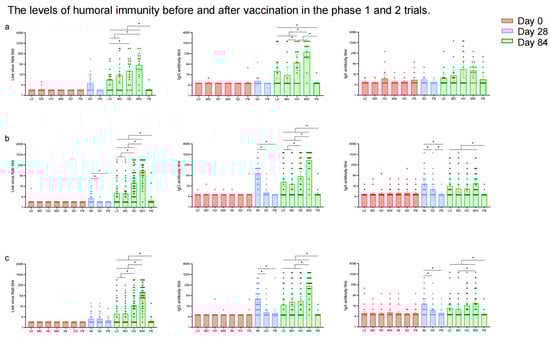 Showing GMTs of neutralizing antibodies to live SARS-CoV-2, RBD-IgG antibodies, and sera IgA antibodies in phase 1 trial (a); GMTs of neutralizing antibodies to live SARS-CoV-2, RBD-IgG antibodies, and sera IgA antibodies in 18–59-year-old populations in phase 2 trial (b); GMTs of neutralizing antibodies to live SARS-CoV-2, RBD-IgG antibodies, and sera IgA antibodies in ≥60-year-old populations in phase 2 trial (c) before vaccination and 28 days after the last vaccination. Error bars indicate 95% CIs. * means p < 0.05 in pairwise comparison.