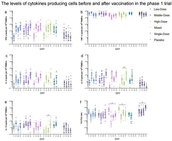 IFN−γ (a), TNF−α (b), IL−4 (c), IL−5 (d), IL−13 (e) cytokine-producing cell responses and Th1/Th2 (f). Data are mean (95% CI) of positive spot counts per 105 PBMCs. Error bars indicate 95% CIs. * means p < 0.05.