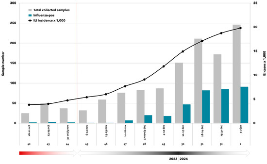 Weekly distribution of total collected samples (n = 1230), influenza laboratory-confirmed samples (n = 359), and ILI incidence per 1000 inhabitants [7]. RespiVirNet surveillance system and surveillance season 2023/2024 (16 October 2023–7 January 2024).
