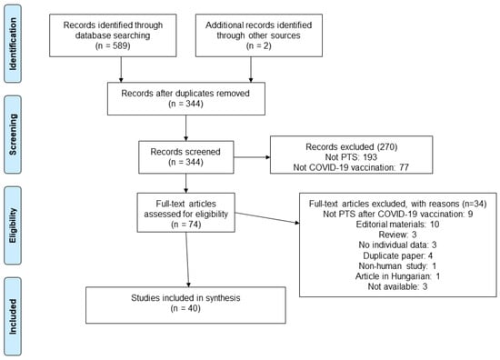 The literature search resulted in 589 records. After deduplication, 344 articles were included for the title- and abstract-screening phases of the systematic review. Finally, we identified 74 papers on PTS in patients with previous COVID-19 vaccination to assess in full text, and 40 articles were ultimately included; the reasons for exclusion are noted in the PRISMA chart (Figure 1).